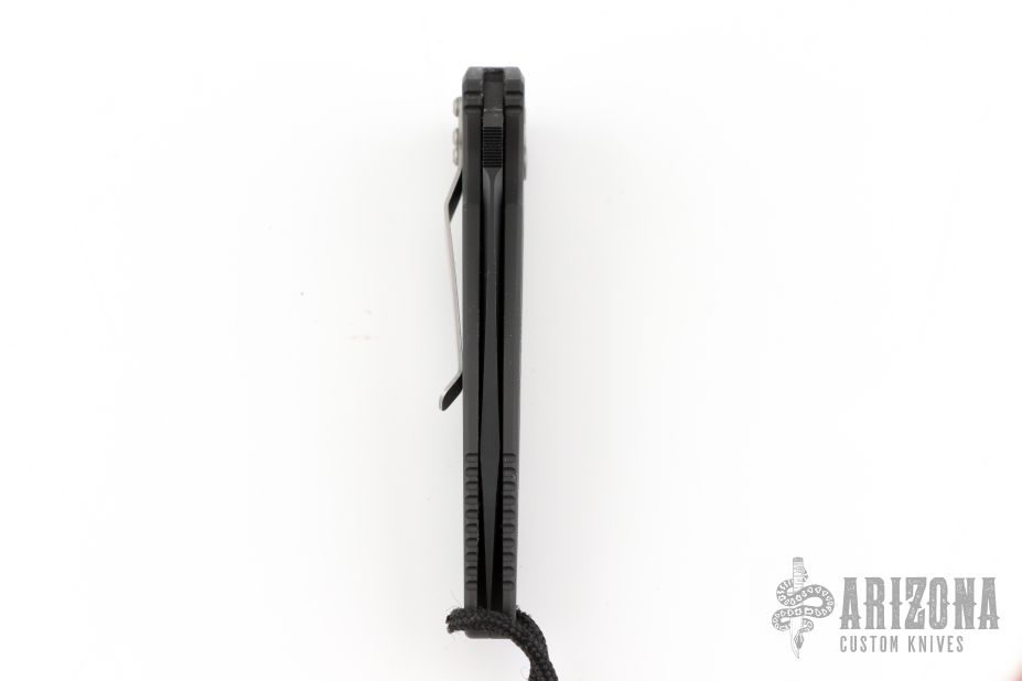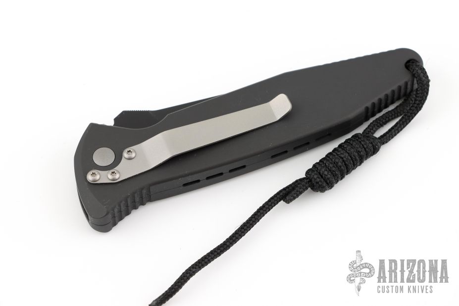 This Mini Socom Auto has a black coated 154-CM stainless steel tanto blade. Handle is black aluminum with non-slip inserts, lanyard, and bead blasted titanium tip down clip. Comes with original clamshell box, papers, and nylon belt sheath. Excellent condition.