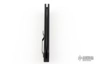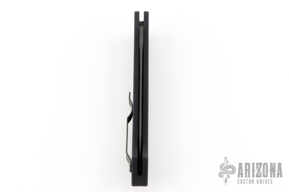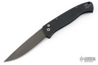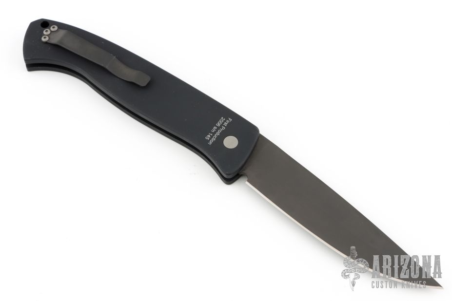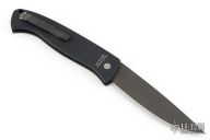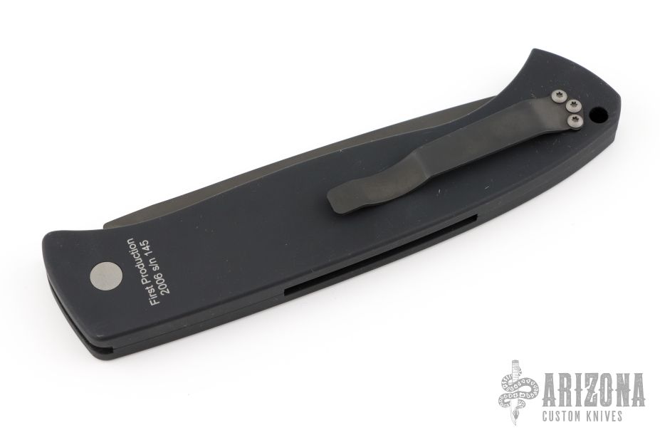The Walter Brend designed/Pro-Tech collaboration - Brend Auto #1. Walter's and Pro-Tech's logos are on the face side of the frame. Side mount push button open/close. Contoured handle, solid action, and an awesome side deploy blade. DLC black coated blade and handle. Tip up black stainless steel clip. Includes the original box, papers and a nylon sheath.  Has a couple light scuffs, otherwise Excellent Condition.