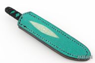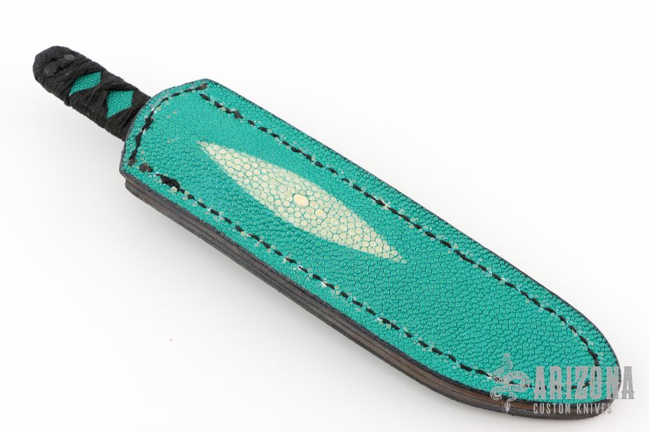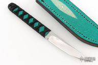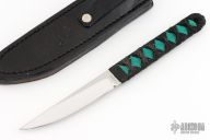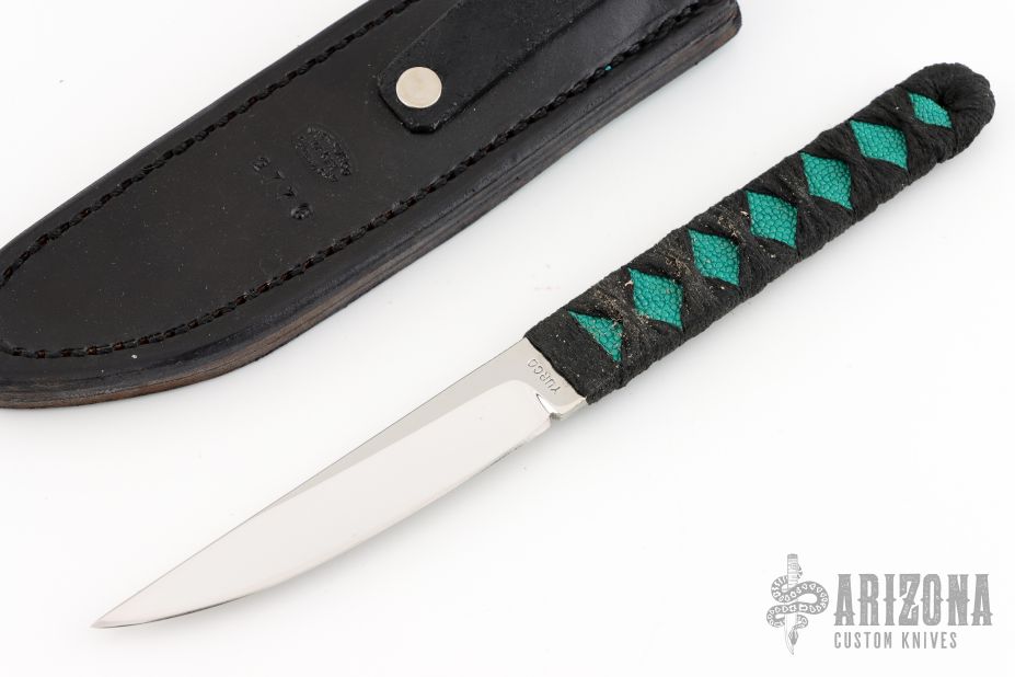 This Tanto by Mickey Yurco features a mirror finished blade with notched thumbrest, .131" blade thickness and .710" blade depth. The handle has black cord wrap over green rayskin. Comes with black leather belt sheath with teal rayskin overlay. New condition.