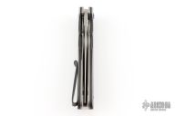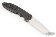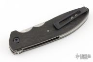 This Model 15 by Jason Clark features a satin finished blade with false top edge and a checkered flipper. The handle has TechnoCarbon scales, blasted titanium liners, blackened titanium tip up pocket clip and a floating stainless steel backspacer. Includes a leather slip sheath with COA. New condition.