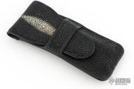 This slipjoint by Todd Kopp features a Damascus blade with nail nick and fileworked spine. The handle has fluted stainless steel bolsters, gold lip pearl covers, fileworked stainless steel liners and spring. Has half-stop. Comes with a stingray pouch. Excellent condition.
