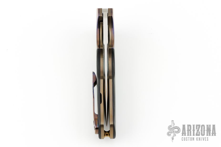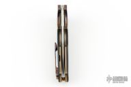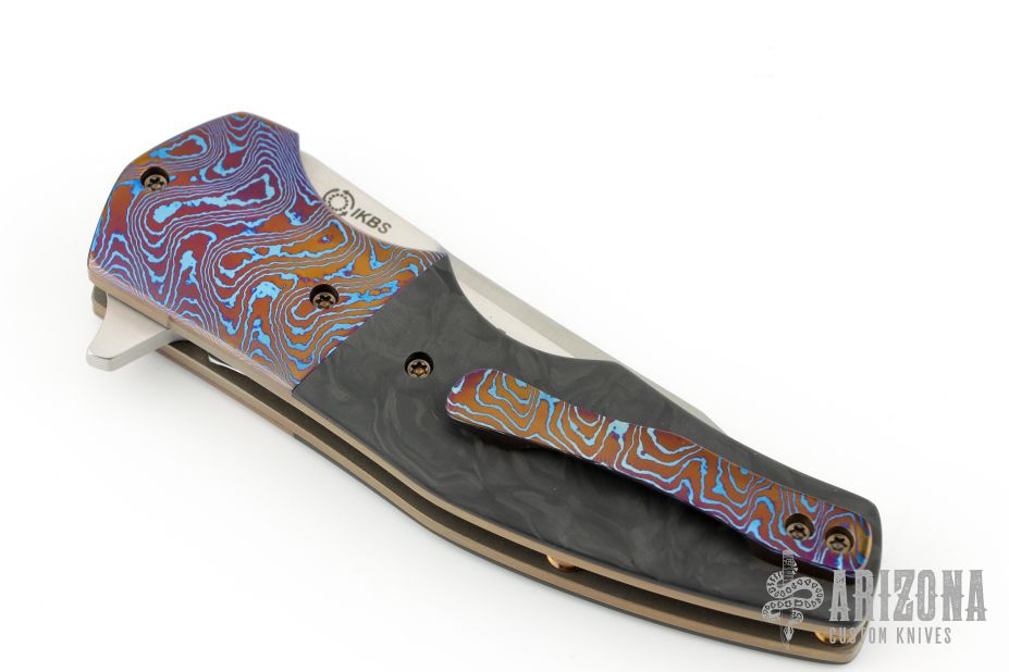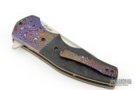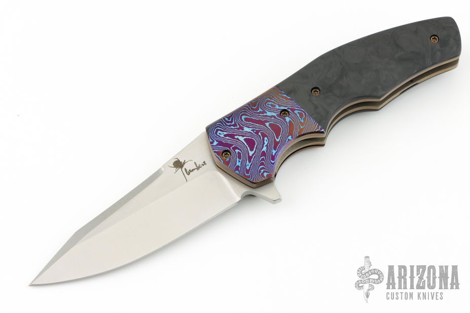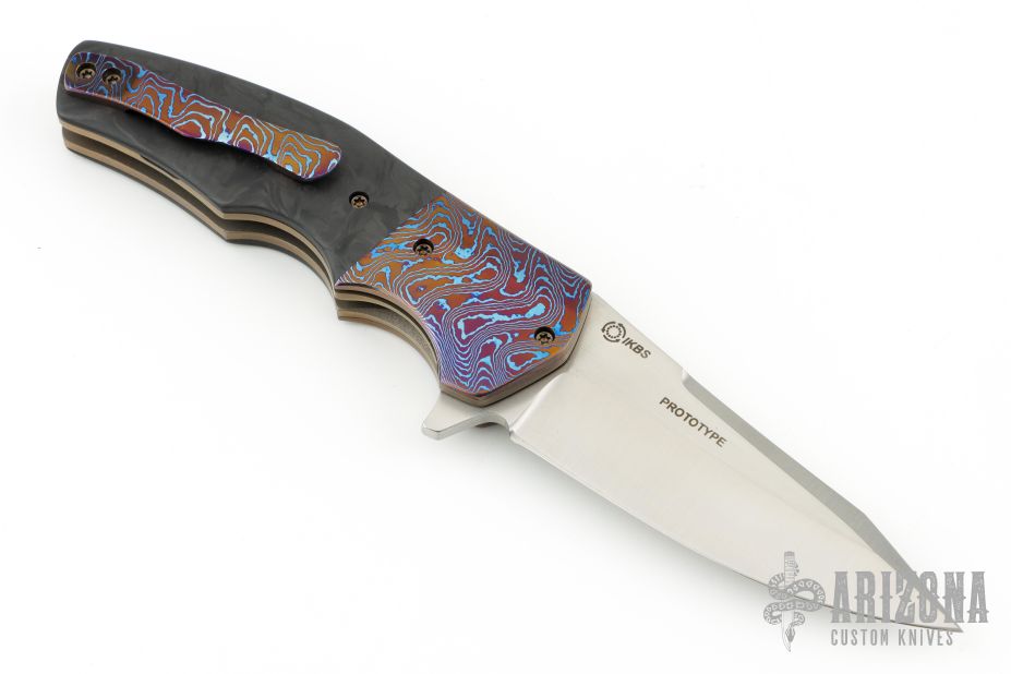 This Prototype Crossroads Flipper by Kirby Lambert has a satin finished blade with false top edge and a flipper. Handle has MokuTi bolsters and tip up clip, marble carbon fiber scales, anodized titanium liners, anodized screws and pivot. Comes with a zippered case. Nice detent, lockup and blade seating. Excellent condition.