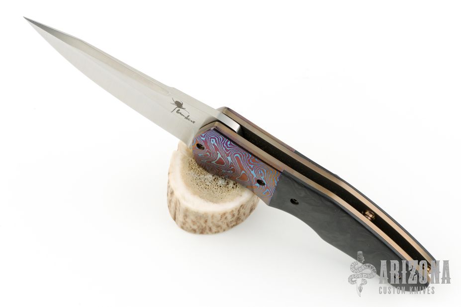 "I believe that in order to make a superior knife you must use superior materials. That is why I work with top grade, high-tech materials. The steels I generally use in my folders and fixed blades are CPM S30v, CPM 154 CM, BG-42, and Damasteel. The handle materials I mostly use range from G-10, Micarta, and carbon fiber to mother of pearl and fossilized mammoth ivory. I exclusively use 6al/4v titanium for the liners in my folders. I mostly make my bolsters from materials such as 6al/4v titanium, damascus, carbon fiber, timascus or mokume. When making Japanese style blades I generally use 1050, 1084, or L6. The handles will usually consist of a phenolic handle covered in stingray skin then wrapped with a nylon cord that has been impregnated with resin to give it maximum strength, toughness, and longevity. I am constantly striving for perfection in creating, for what I feel is one of the highest quality knives on the market today."