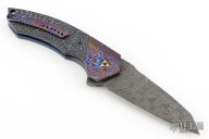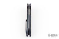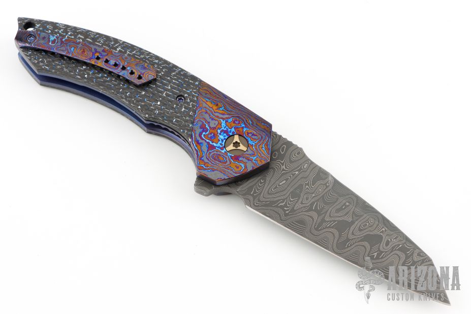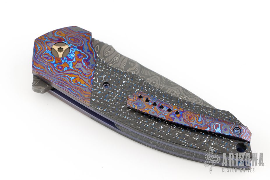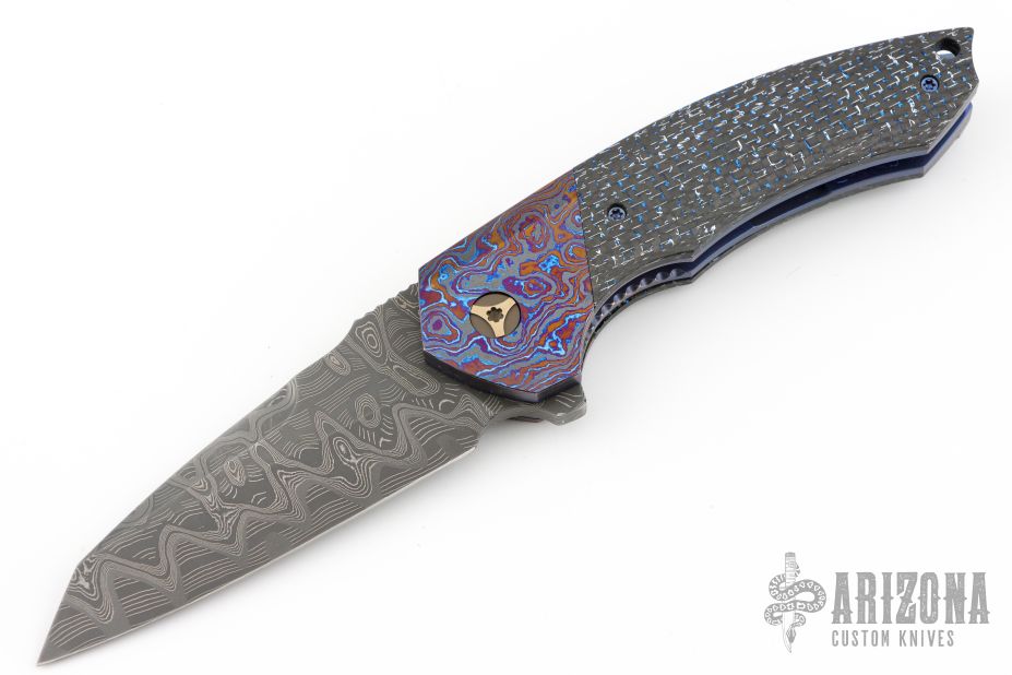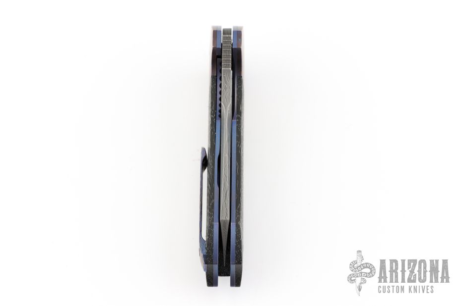 This Cure Linerlock Flipper by Peter Carey features a Mike Norris Hornets Nest Stainless Damascus blade with notched thumbrest and flipper. The handle has 3-alloy black timascus bolsters, blue/silver lightning strike carbon fiber scales and backspacer, orange peel finished and blue anodized titanium liners, tip up 3-alloy black timascus clip. Nice lockup, detent, and seating. Caged Bearings. Very smooth opening action. Comes with zippered case and COA dated 4-2-15. Excellent condition.