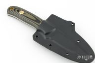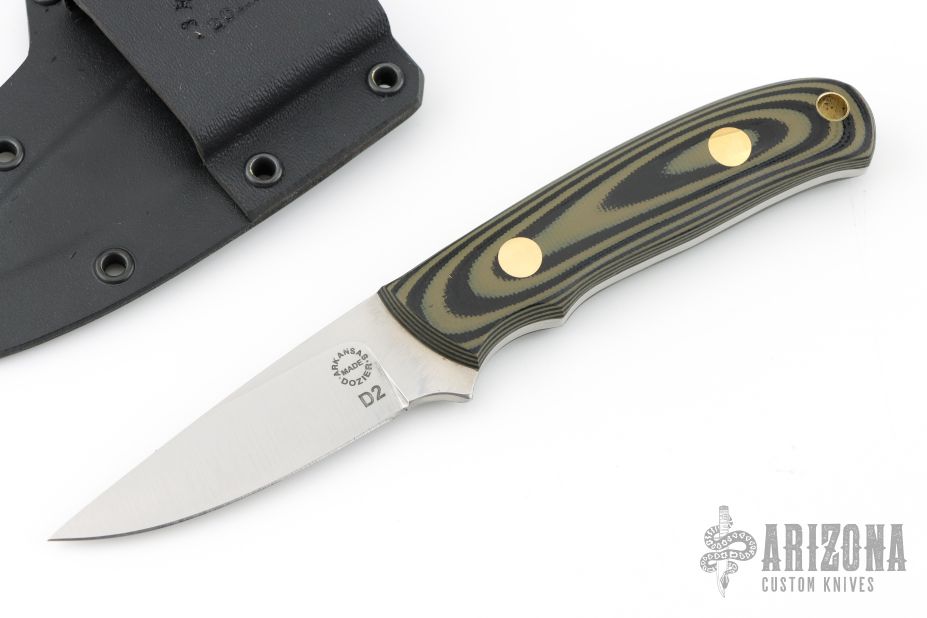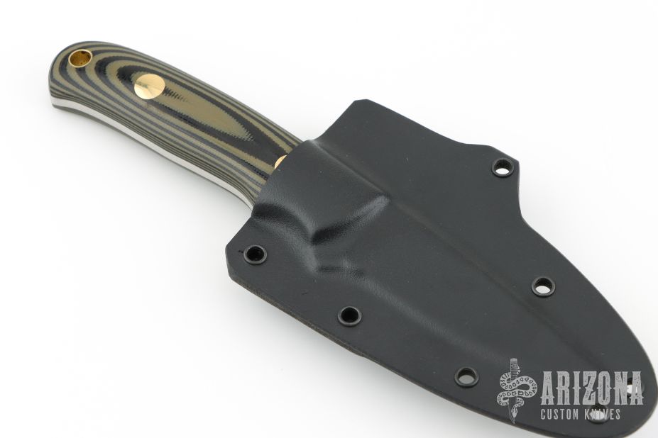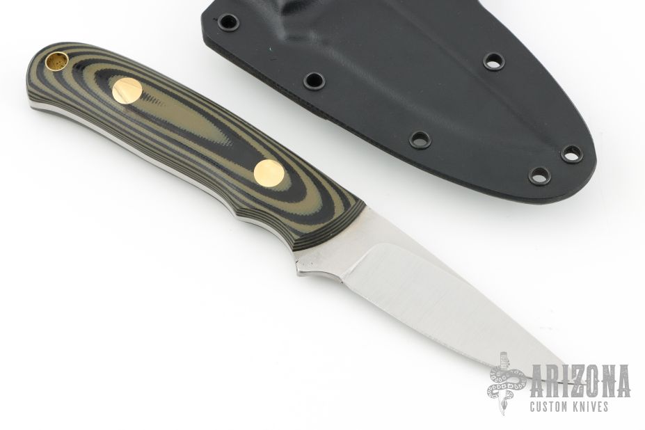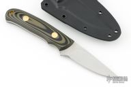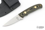 This K-33 Bird and Trout features a satin finished blade, .124" blade thickness and .840" blade depth, full tang construction. The handle has black/green G-10 scales, brass pins and lanyard hole. Comes with a kydex sheath with belt clip. New from maker.