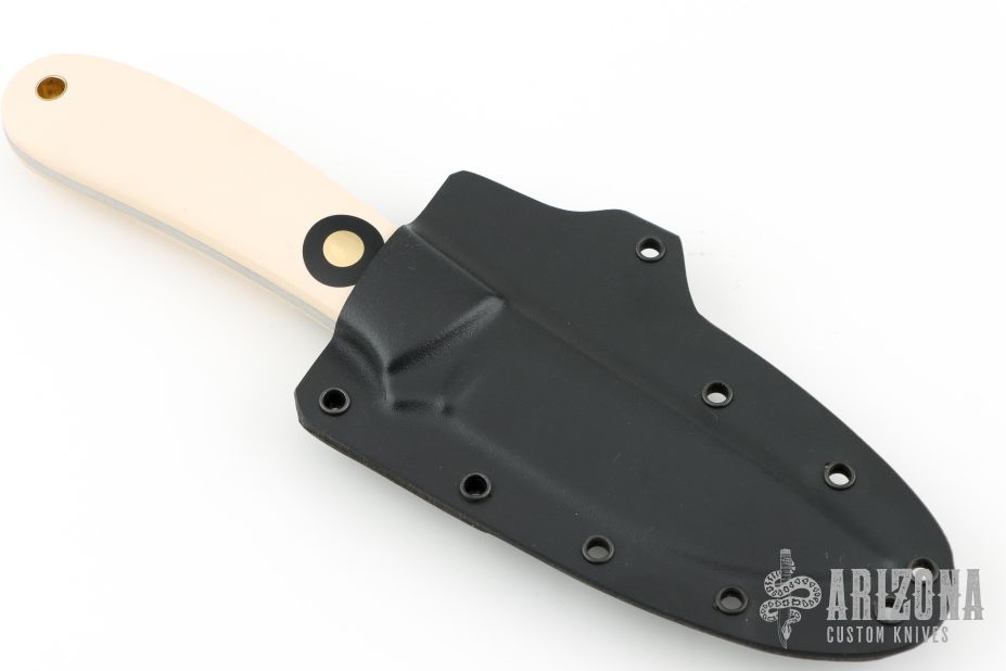 This K-16 Yukon Pro Skinner by Dozier Knives features a satin finished blade with .132" blade stock and 1.026" blade depth, full tang construction. The handle has white paper micarta scales with black paper micarta inserts and brass pins and lanyard hole. Comes with kydex sheath with belt clip. New from maker.