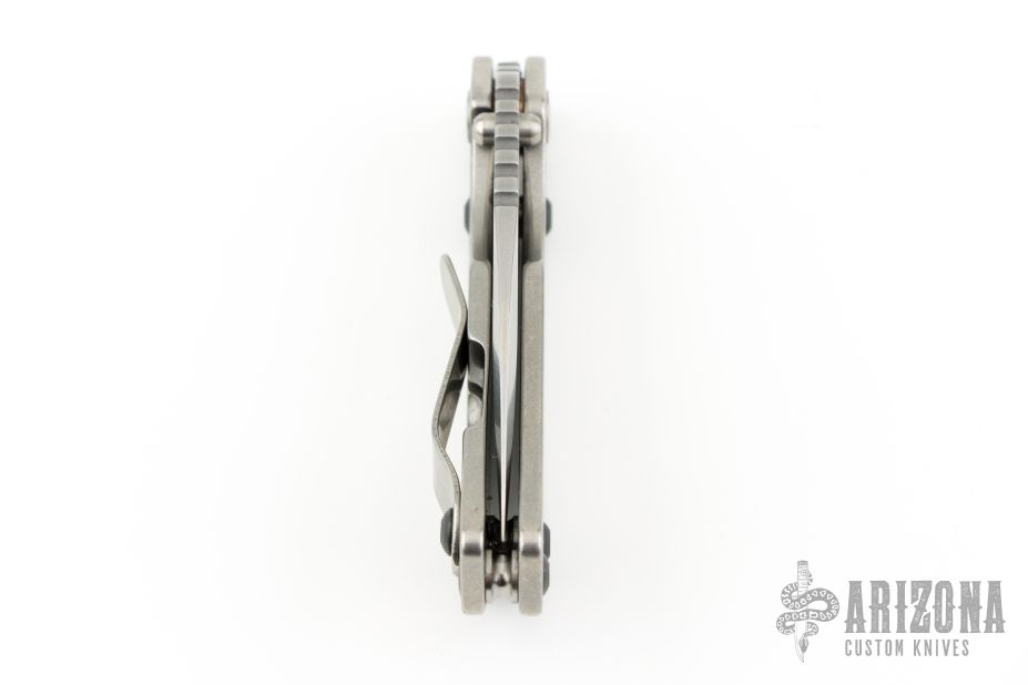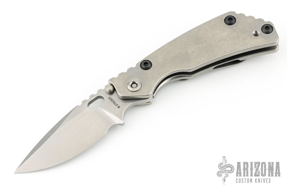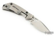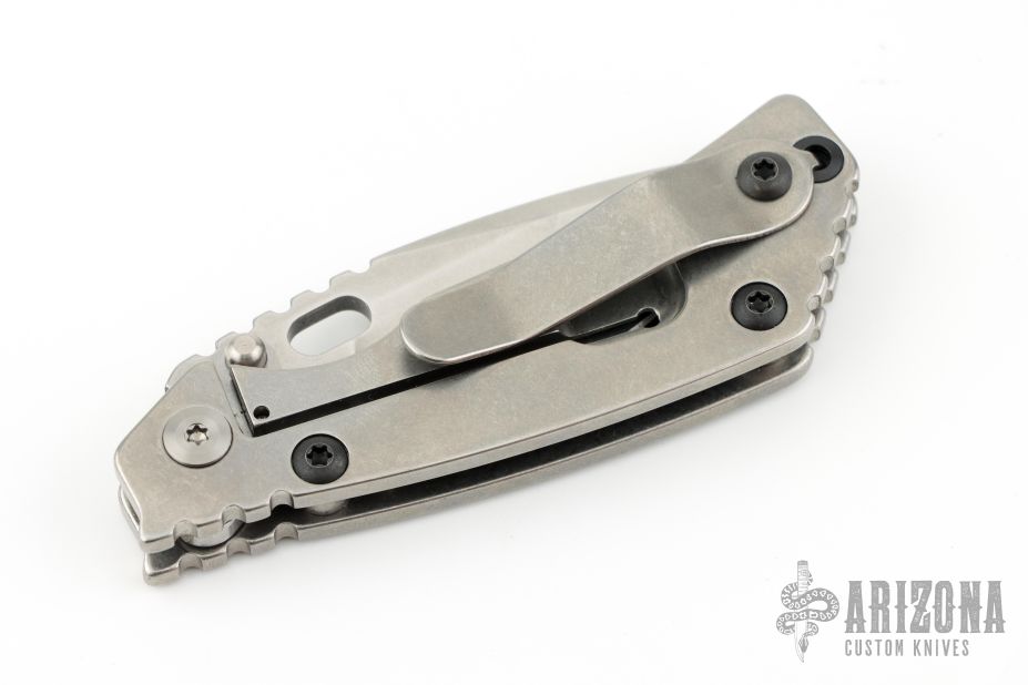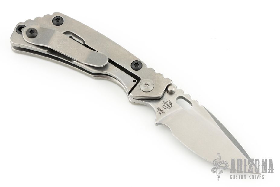 This PT Hybrid by Mick Strider features a stonewashed blade with notched thumbrest and thumbhole. The handle has a stonewash finished titanium frame with matching tip up clip. Excellent Condition.