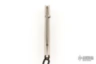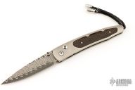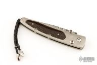 This William Henry is about style and performance. Sleek, light, tough, and elegant, each of these knives showcases the unmatched sharpness of ZDP-189 laminate blade steel with the durability of titanium handles. Onyx inlays in the thumb stud and button lock. The handle also has black palm wood inlays. Comes with a leather pocket slip sheath with stainless clip. Excellent condition.
