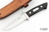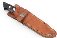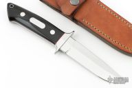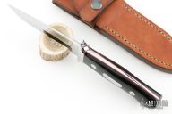 This Mini Wilderness Fighter by Elton Misner features a mirror polish finished clip point blade (CPM 154 CM) with false top edge, .207" blade stock and 1.011" blade depth. The handle is comprised of micarta covers with red liners and a mirror polished stainless steel guard. Full tapered tang construction with lanyard hole in pommel. Includes a leather belt sheath and zipper case. New from maker!