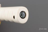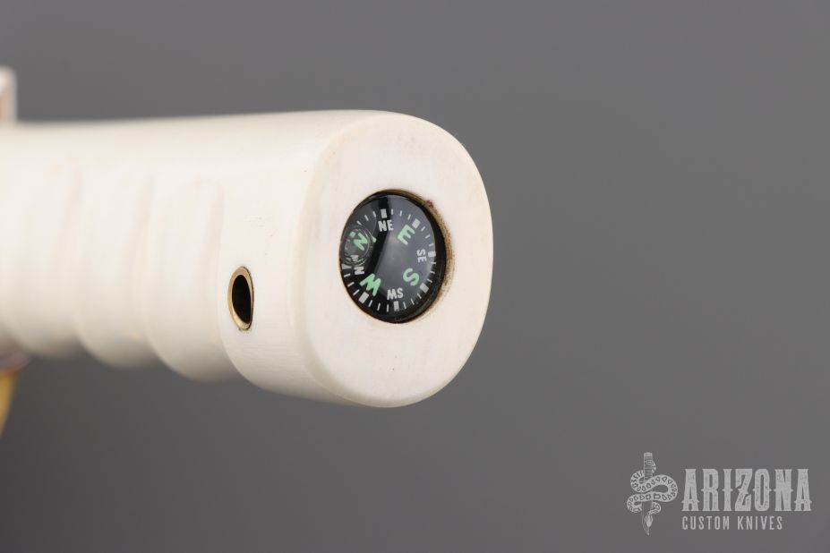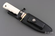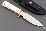 The Model 11 is the original drop-point blade. Designed by Tommy Thompson, noted Alaskan guide, in 1952 for big-game skinning, with point dropped below top of blade to prevent cutting too deeply through skins when used point first. The blade is satin finished with a notched thumbrest, .237" blade stock and 1.313" blade depth, hidden tang construction. The handle has a brass guard, finger groove ivorite grip, red/white/blue spacers, lanyard hole in the butt along with a compass. Comes with a black leather sheath with sharpening stone and a zippered case. "Dylan J Dalrymple" on the blade. Excellent condition.