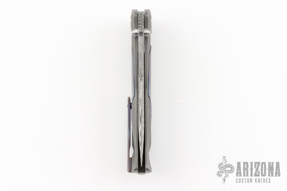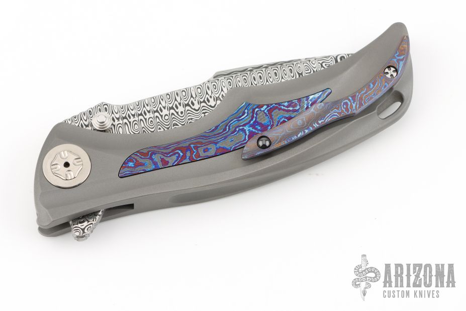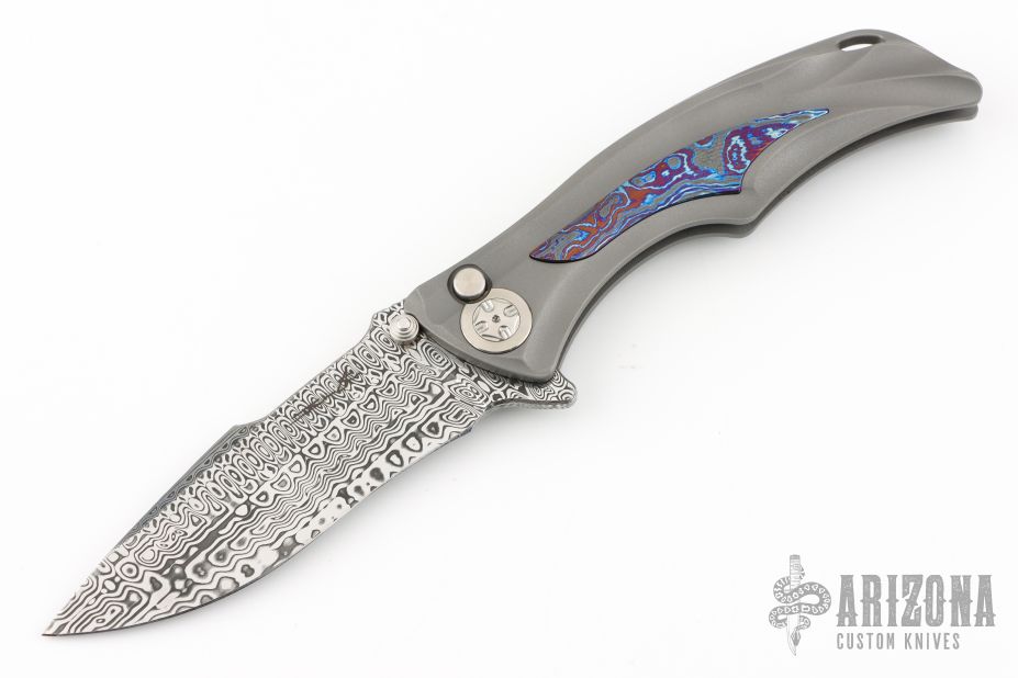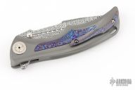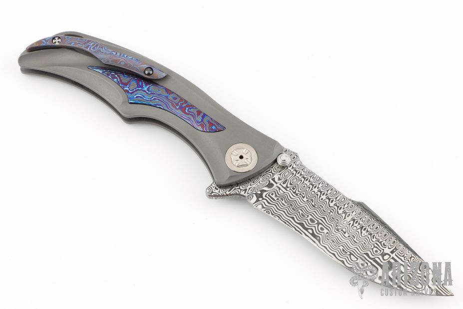 This Tighe Down Button Lock Flipper by Brian Tighe features a Damasteel multi-ground blade with notched thumbrest, flipper and dual thumbstuds. The handle has an integral titanium frame with Timascus inlays and a matching tip up clip with ceramic ball inlay. Satin finished titanium collar. Comes with Maker's zipper case. Has a couple light scuffs, excellent condition otherwise.
