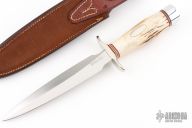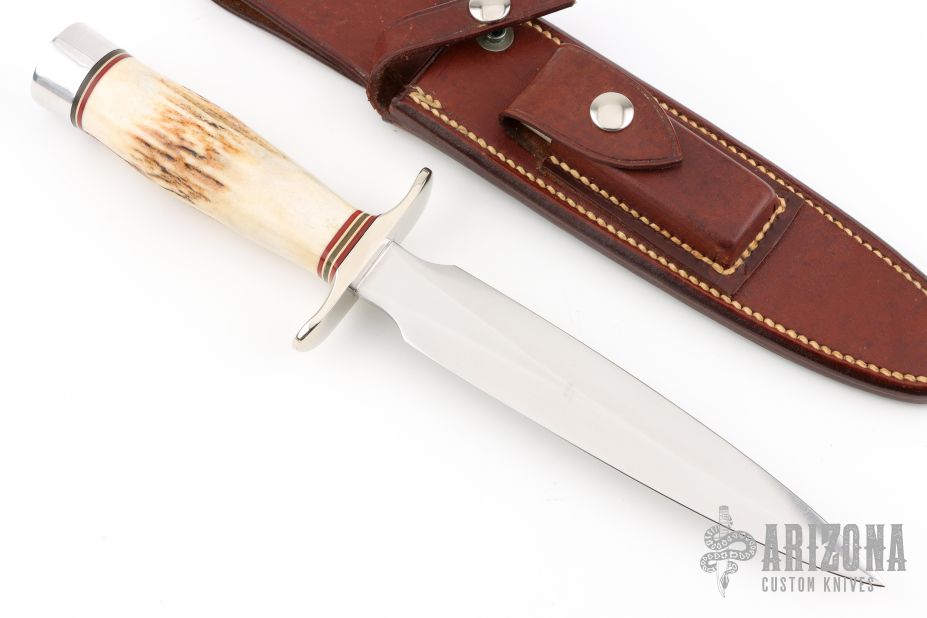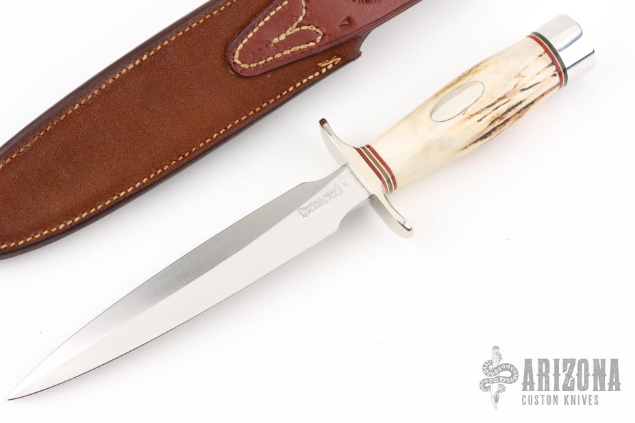 The Model 2-7 by Randall Made Knives has a nickel silver guard, stag grip with nickel silver escutcheon, duralumin butt cap, red/white/blue spacers. Satin finished double edged blade, .201" blade stock and 1.140" blade depth, hidden tang construction. Comes with a brown leather Johnson roughback sheath, and a zippered case. Excellent condition. This knife dates between 1966-1972