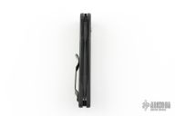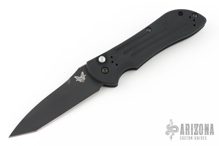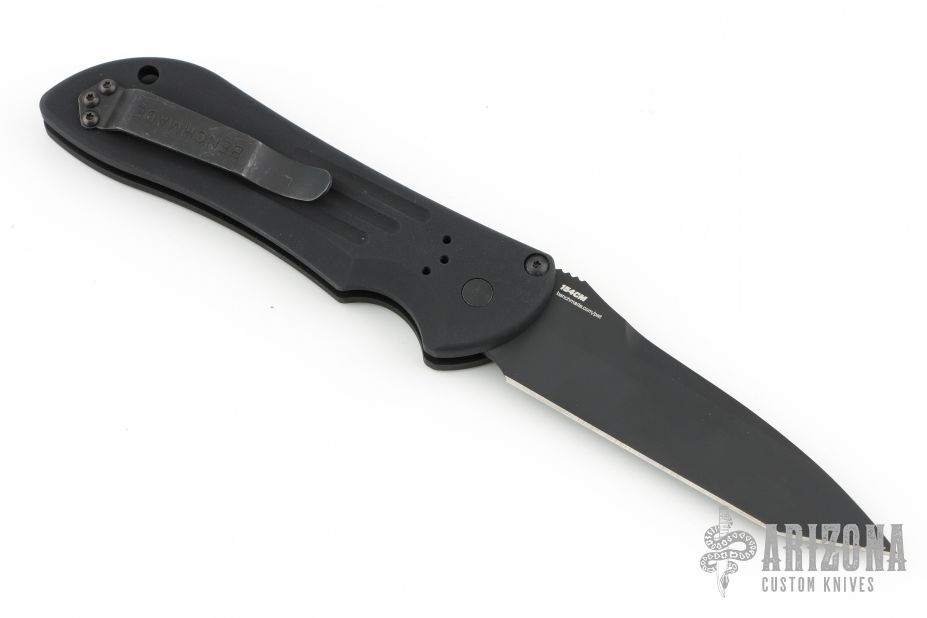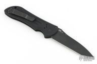 This 9101SBK AUTO Stryker from Benchmade features a black coated drop point tanto style blade with swedge, notched thumb rest. The handle is comprised of milled black aluminum frame with a black coated stainless steel tip up clip. Safety on backspacer and lanyard hole in pommel. Comes with original box and papers. Has a couple light scuffs, otherwise Excellent condition.