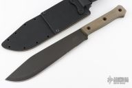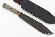 This Northwoods Bowie by Journeyman Smith Dave Wenger features a black blade, .162" blade stock and 2.317" blade depth, full tang construction. The handle has green canvas micarta scales with black tubes. Comes with a kydex sheath with canvas micarta welt and a brown leather belt loop. It has some light scuffs, otherwise excellent condition. Comes with COA dated 1-9-24