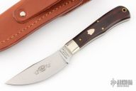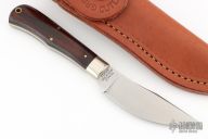 This knife by Great Eastern Cutlery features a satin finished blade with .108" blade stock and .978" blade depth, full tang construction. The handle has nickel silver bolsters, cocobolo scales and brass liners and pins. Comes with a brown leather sheath and original packaging. Excellent condition.