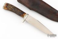 This knife by Ken Coats features a satin finished blade with false top edge, .109" blade stock and 1.163" blade depth, hidden tang construction. The handle has a nickel silver guard and butt, stag grip with black/white spacers. Comes with a brown leather sheath and a zippered case case. Excellent condition.