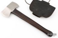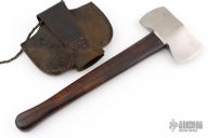 This Double Bit Saddle Axe by James P Miller has a satin finished head with one thick edge and one thin edge. Has a curly/flamed wood haft. Comes with a brown leather sheath. Has a couple light spots on the blade, otherwise excellent condition. Beautiful wood handle.
