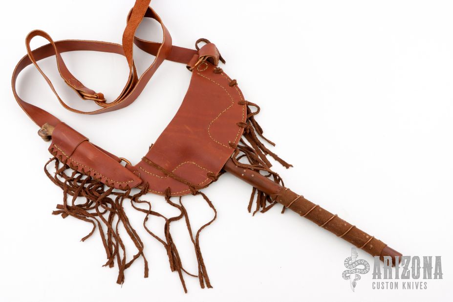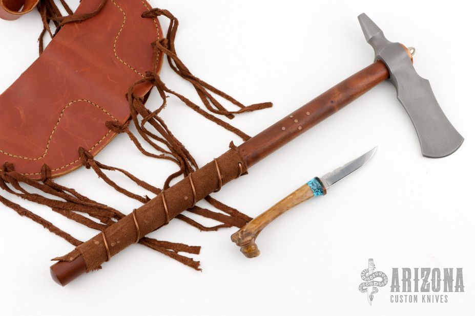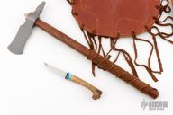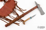 This tomahawk by Master Smith J Neilson features a hand forged blade with acid washed finish, .245" blade stock and a 1.75" blade length, 6.375" from edge to hammer poll, 15.25" haft. The haft features a wood grip with copper accent pins, wrapped leather and copper wire. Includes a very nice brown leather sheath that holds the tomahawk and knife.