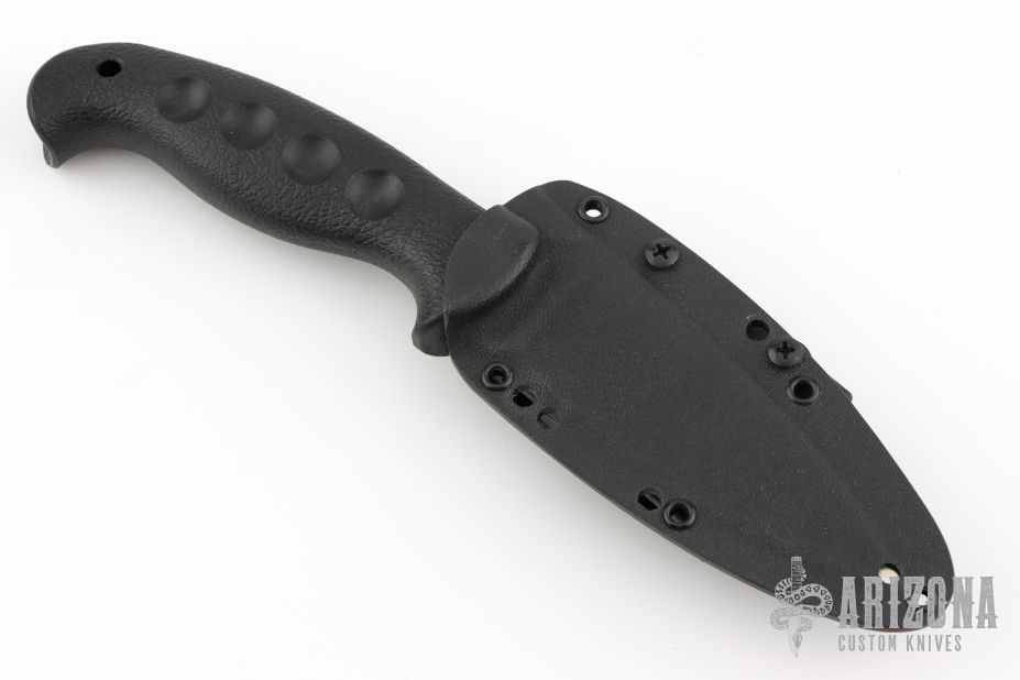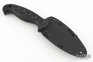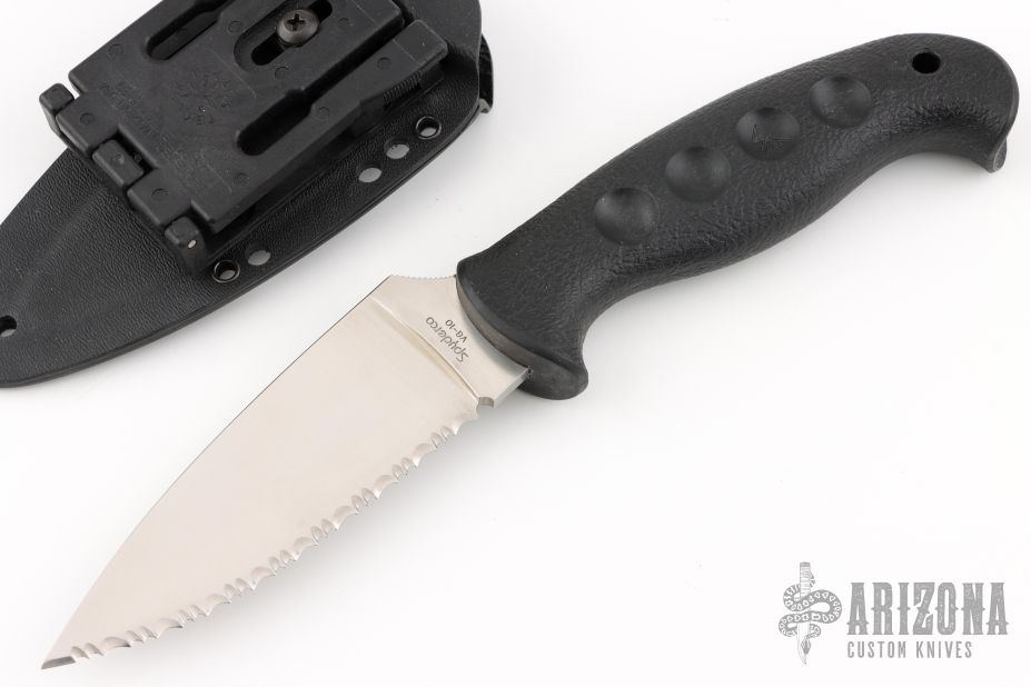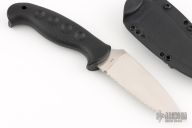 This Temperance from Spyderco features a satin finished drop point blade with notched thumbrest and fully serrated edge, 1/8" blade stock and 1 3/8" blade depth, full tang construction. The handle is black plastic. Comes with kydex sheath with TekLok, original box, and papers. Has a couple light scratches, excellent condition otherwise.
