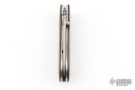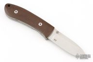 This DK-FHM linerlock folder by Dozier Knives has a satin finished D2 stainless steel drop point D2 blade with notched thumbrest and single thumb stud. Handle is has brown canvas micarta scales, titanium liners and a black G-10 backspacer. Excellent condition. Dated 2004