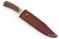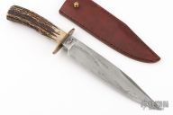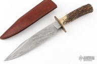 This Stag handled bowie from Master Smith Bill Bagwell features a Damascus clip point blade with sharpened top edge, .404" blade stock at the ricasso and 1.600" blade depth, hidden tang construction. The handle has a brass guard and stag grip with two brass pins. Includes a brown leather sheath. Excellent condition.