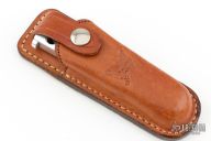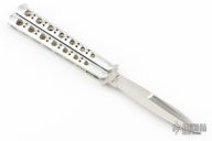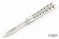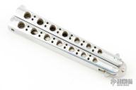 This early balisong from Pacific Cutlery features a Jody Samson ground satin finished blade. The handles are aluminum with hole pattern. Comes in a leather Bali-Song belt sheath. There are scuffs and scratches on the latch. There are scuffs and scratches throughout, has been used. Good condition otherwise.