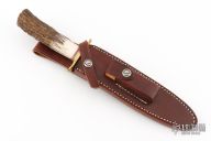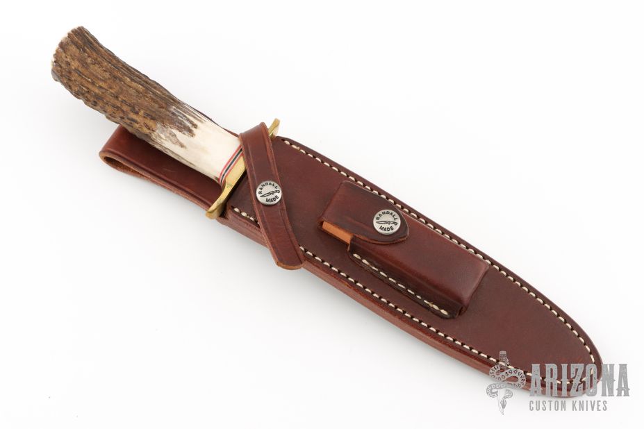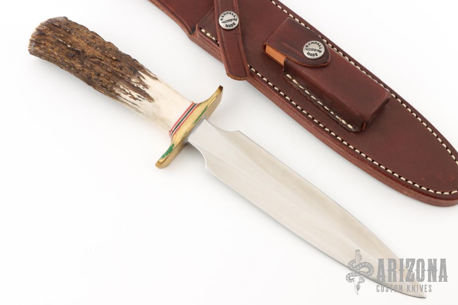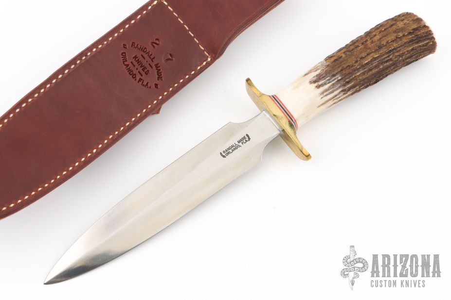 This Model 2-7 Dagger by Randall Made Knives features a double-edged satin finished blade with .216" stock and 1.295" blade depth, hidden tang construction. The handle has a brass guard with red/white/blue spacers and a stag grip. Comes with a brown leather sheath and a Randall zippered case. Excellent condition.