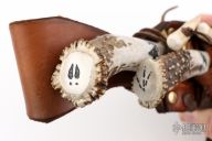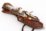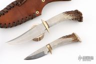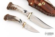 This Hunting Set by Ken Richardson features an upswept blade with jeweled flats and satin grinds, .095" blade stock and 1.251" blade depth, hidden tang construction. The handle has a brass guard and crown stag grip, red/white/black spacers. Has scrimshaw on the handle. The smaller knife has a drop point blade with jeweled flats and satin grinds, .095" blade stock and .925" blade depth, hidden tang construction. The handle has a crown stag grip. Has scrimshaw on the handle. Comes with a brown leather sheath that holds both knives. Has some light scratches, otherwise excellent condition.