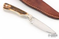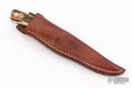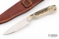 This Utility by David Manley has a mirror polished blade with notched thumbrest, .123" blade stock and .787" depth, full tang construction. The handle has stag scales with nickel silver pins. Comes with a brown leather sheath. Dated '00 and #1631. Excellent condition.