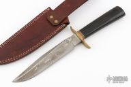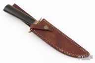This Model 1-7 by Blackjack Knives features a satin finished blade with false top edge, .214" thick and 1.185" deep, hidden tang construction. The handle has a brass guard, black linen micarta grip with red/white/black spacers. Comes with a brown leather sheath. Has some patina and oxidation on the blade, a few scratches on the grip, otherwise good user condition.