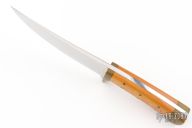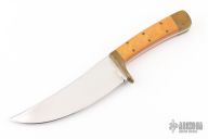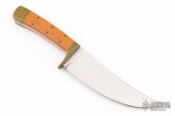 This knife by Rudy Wehner features a mirror polished blade with .238" blade stock and 1.683" blade depth, full tang construction. The handle has a brass guard and rear bolsters, yellow paper micarta scales with brass pins. Has some small spotting on the blade and some light patina, otherwise good condition.