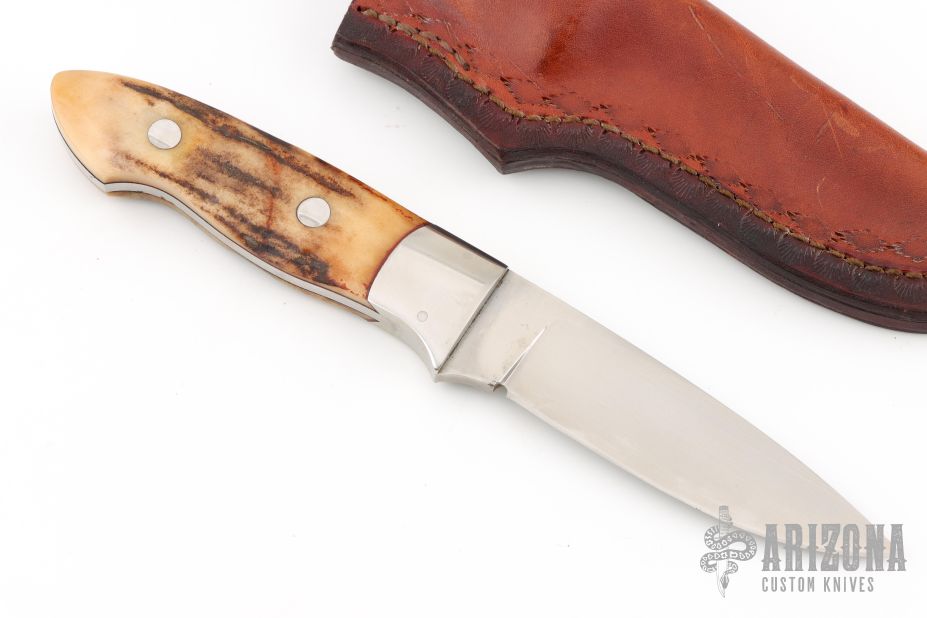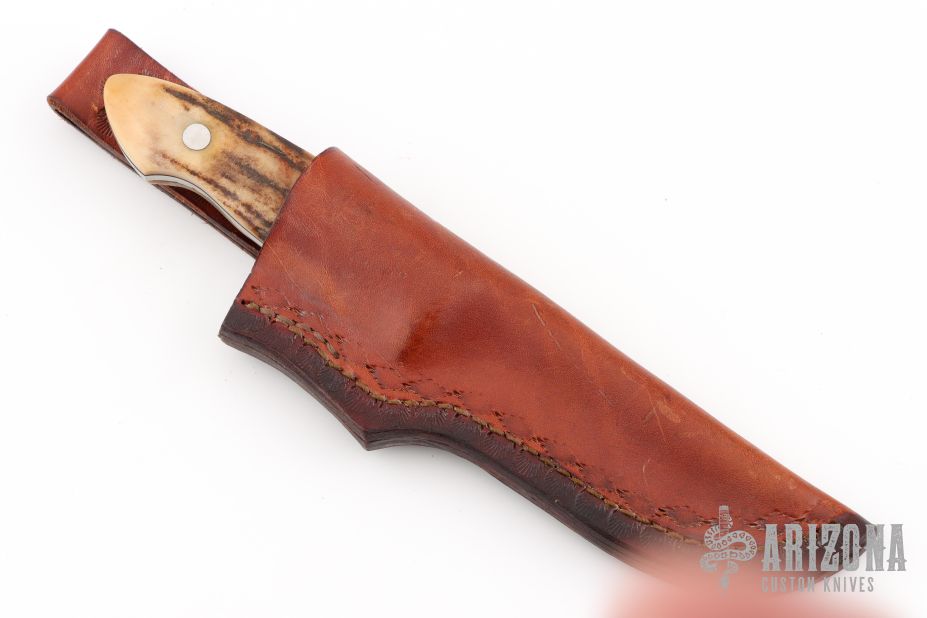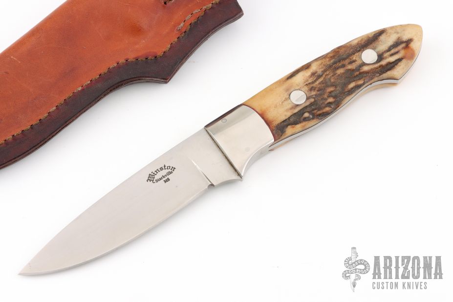 This Hunter from David Winston features a hand rub satin finished blade with .148" blade stock and 1.064" blade depth, full tang construction. The handle has dovetailed stainless steel bolsters, stag scales over red liners. Comes with a hand tooled brown leather sheath. Has a couple light scratches, otherwise excellent condition.