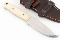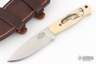This knife by CFK Cutlery Company features a satin finished blade with a notched thumbrest, .169" blade stock and 1.212" blade depth, full tang construction. The handle has scrimshawed bone scales, fileworked tang spine. Comes with a brown leather sheath. Excellent condition.