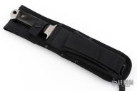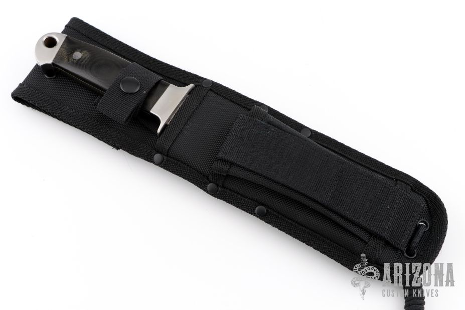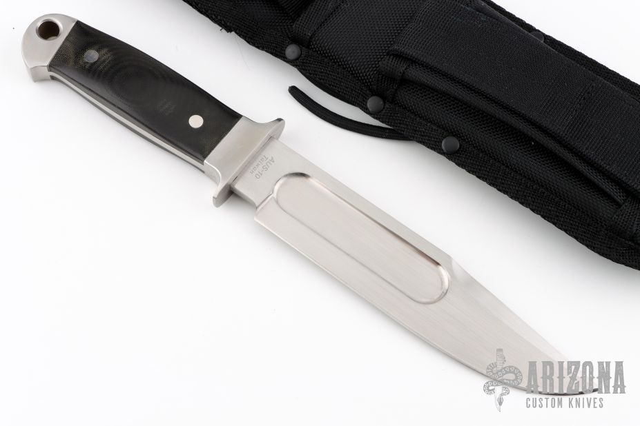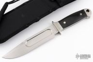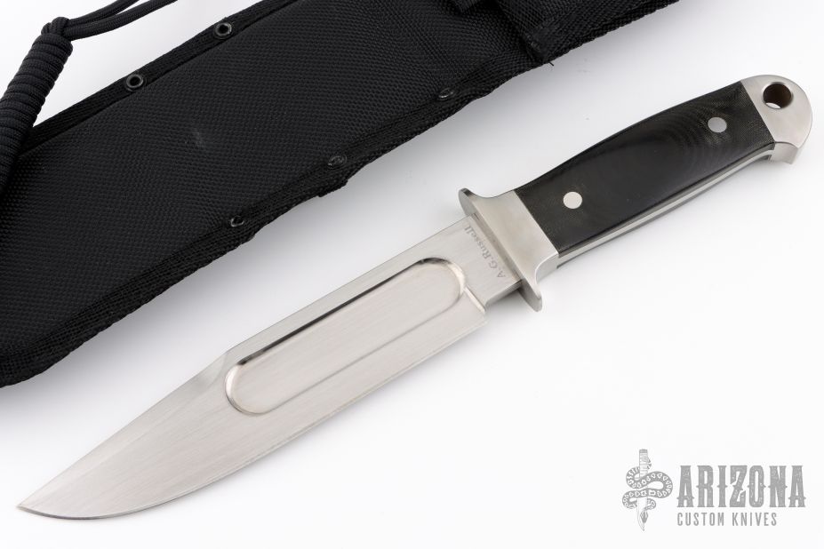 This bowie from A.G. Russell features a hand rub satin finished blade with a false top edge, fuller, .225" blade stock and 1.453" blade depth, full tang construction. The handle has pinned micarta covers, steel guard and butt with lanyard hole in pommel. Comes with a nylon belt sheath. Has a couple light scratches, otherwise Excellent condition.