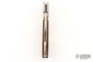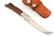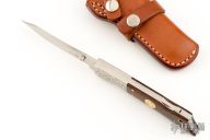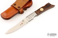 This Gunstock 1 from Al Mar Knives features a drop point satin finish blade with thumbstud. The handle has engraved stainless steel bolsters and titanwood scales with faux bullet casing over stainless liners and lockbar. Lanyard tube in pommel. Comes with a small leather belt sheath designed to look like a holster.  Excellent condition.