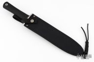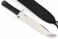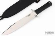 This Trail Master bowie from Cold Steel features a satin finished clip point blade with a false top edge, 5/16" blade stock and 1 1/2" blade depth, hidden tang construction. The handle has a stainless steel guard and a rubber handle. Comes with original box and nylon sheath. Excellent condition.