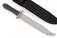 This Australian Bowie by Gerber features a bead blasted clip point blade with a false top edge, .293" blade stock and 1.487" blade depth, hidden tang construction. The handle has a brass guard and rubber handle with lanyard hole. Includes nylon sheath and original box. Oxidation is visible on the blade otherwise the knife is Excellent condition.