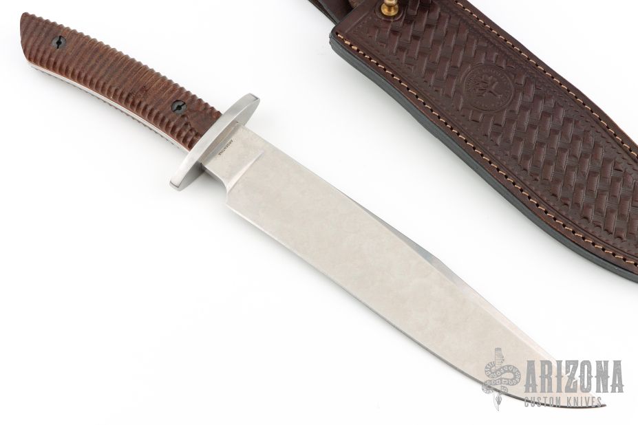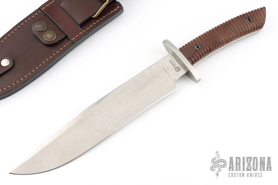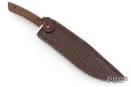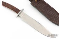 This knife by Boker features a satin finished clip point blade with a full tapered tang construction, .224" blade stock and 1.696" blade depth.  The handle has a steel guard, milled ebony covers and brown liners.  Includes original box and hand tooled leather sheath. Has a couple light scuffs, otherwise Excellent Condition.