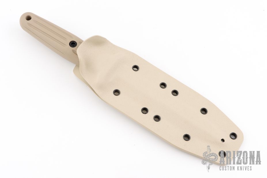 This Applegate-Fairbairn Combat Dagger (#3227) has a bead blasted 440C stainless steel dagger blade with hidden tang. Blade stock is 3/16", depth is 1-1/16". Handle is non-slip tan polymer with contoured grooves, black brass guard, and lanyard hole. Comes with a tan camo kydex sheath, and original box. Listing also includes teklok with hardware. The box is pretty beat up. The knife has some light scuffs, excellent condition otherwise.