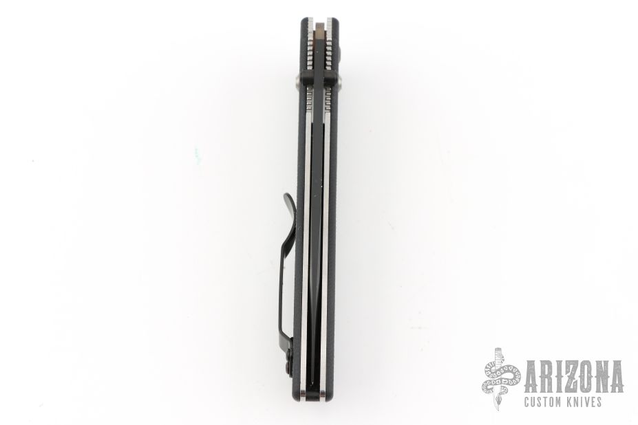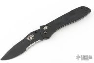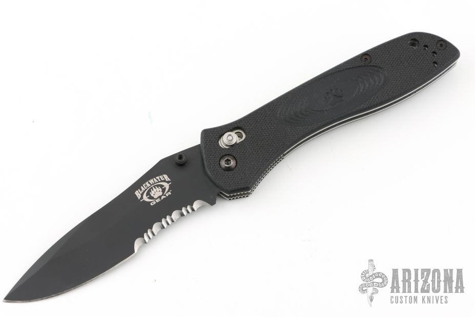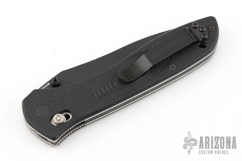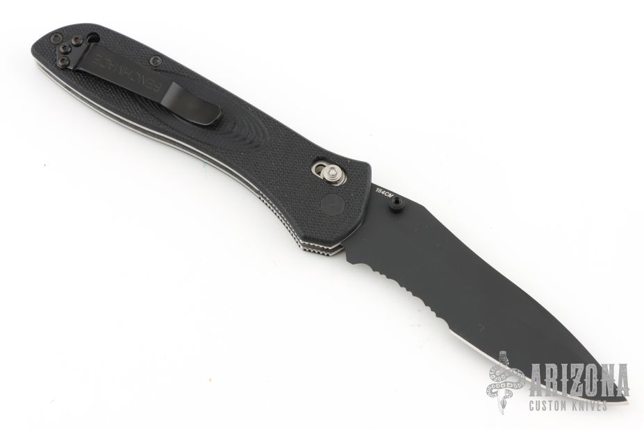 This folder by Bencmade features an black partially serrated blade with swedge and dual thumb studs. The handle is comprised of black G10 scales over stainless steel liners and black polymer backspacer. Lanyard hole in pommel and black coated stainless steel tip down clip is reversible for right or left hand carry. Comes with original box and papers. Excellent condition.