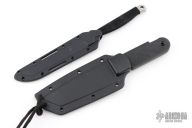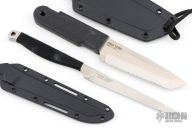 Satin finished tanto serrated blade with rubber grip and lanyard hole. Comes with original box and kydex sheath. Excellent condition.