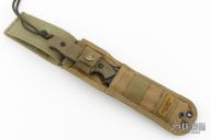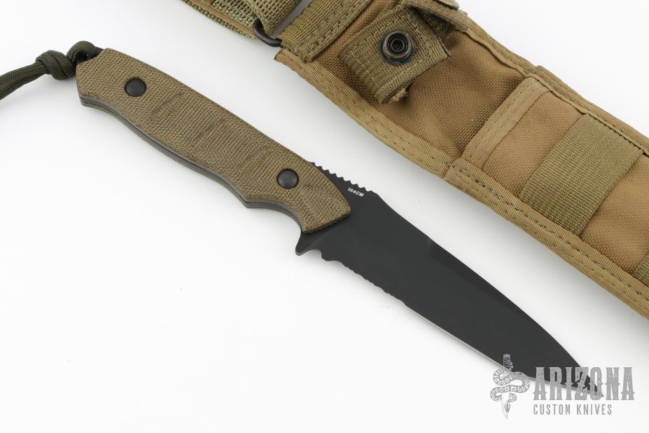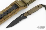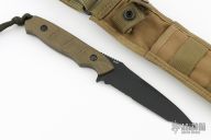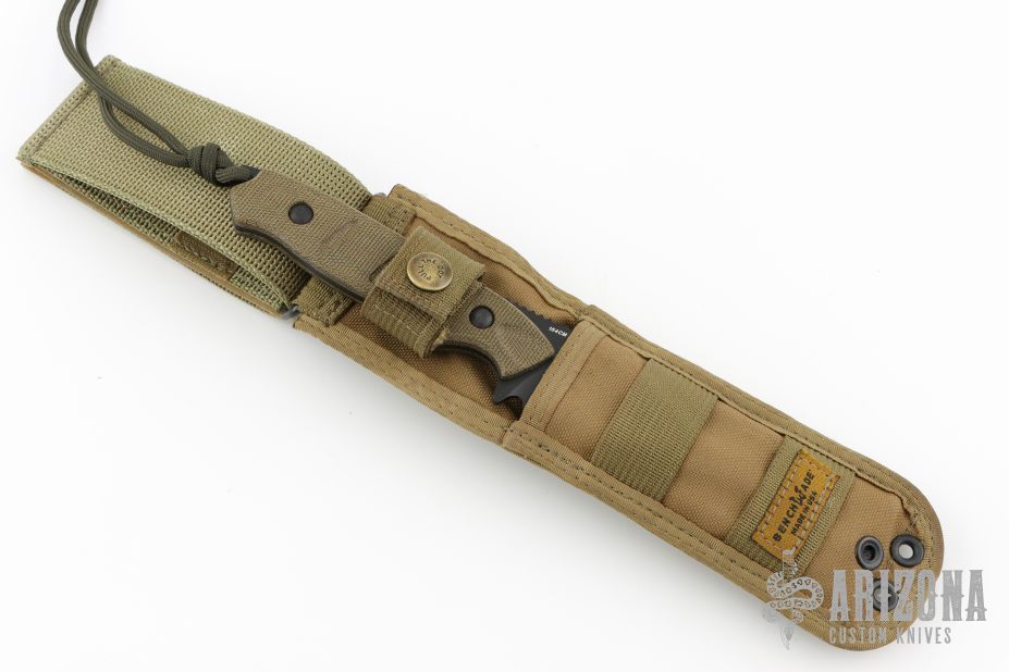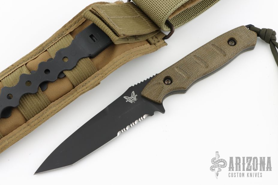 This Nimravus by Benchmade has a black tanto blade with partially serrated edge, 1/8" blade stock and 1 1/8" blade depth, full tang construction with green canvas micarta scales and lanyard hole. Allen Elishewitz design. Comes with original sheath. Has some light sheath scuffs, otherwise excellent condition.