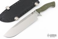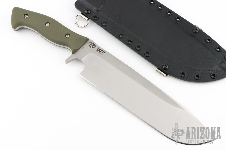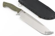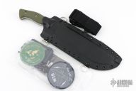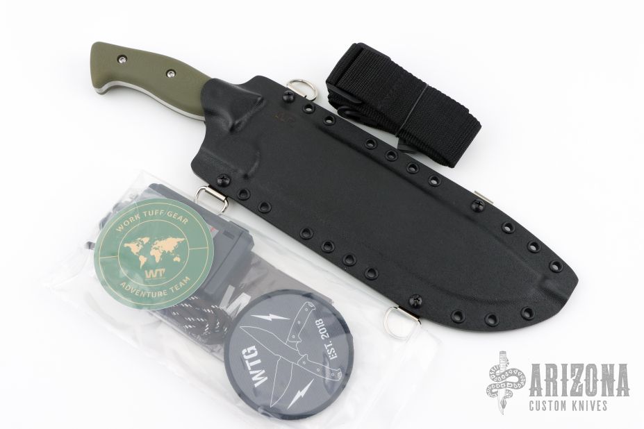 This Grizzly by Work Tuff Gear features a stonewash finished K329 Steel blade with a saber grind that has a convex cutting edge, .230" blade stock and 2.303" blade depth, full tang construction with green G-10 scales. Comes with original box, kydex sheath and extras. First Production Run Dated 05-2023. Excellent condition.