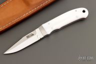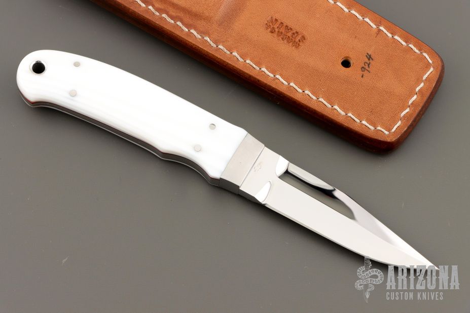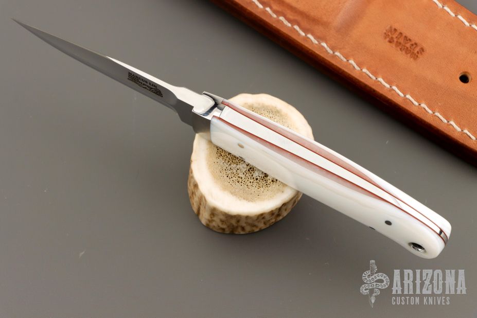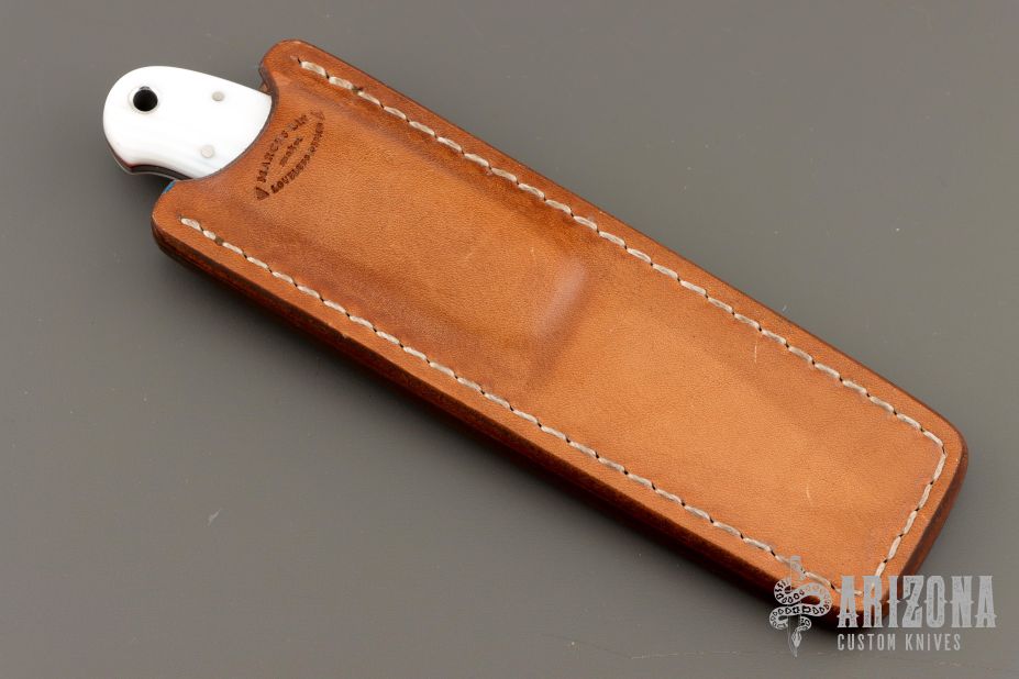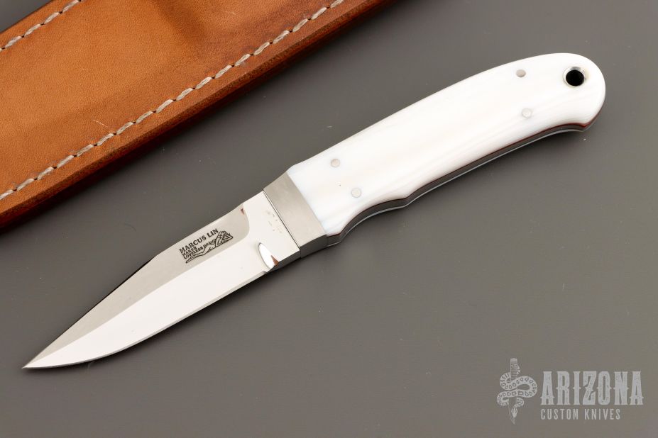 This Loveless Style New York Special by Marcus Lin has a mirror polished blade and sharpened top edge, Single nude Loveless inspired logo, .202" blade stock and .815" blade depth, full tapered construction. The handle has a stainless steel guard, gorgeous mother of pearl scales with red liners. #924 on ricasso. Comes with a brown leather sheath with matching number on the back. Excellent condition.
