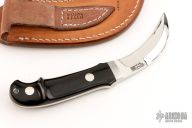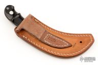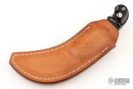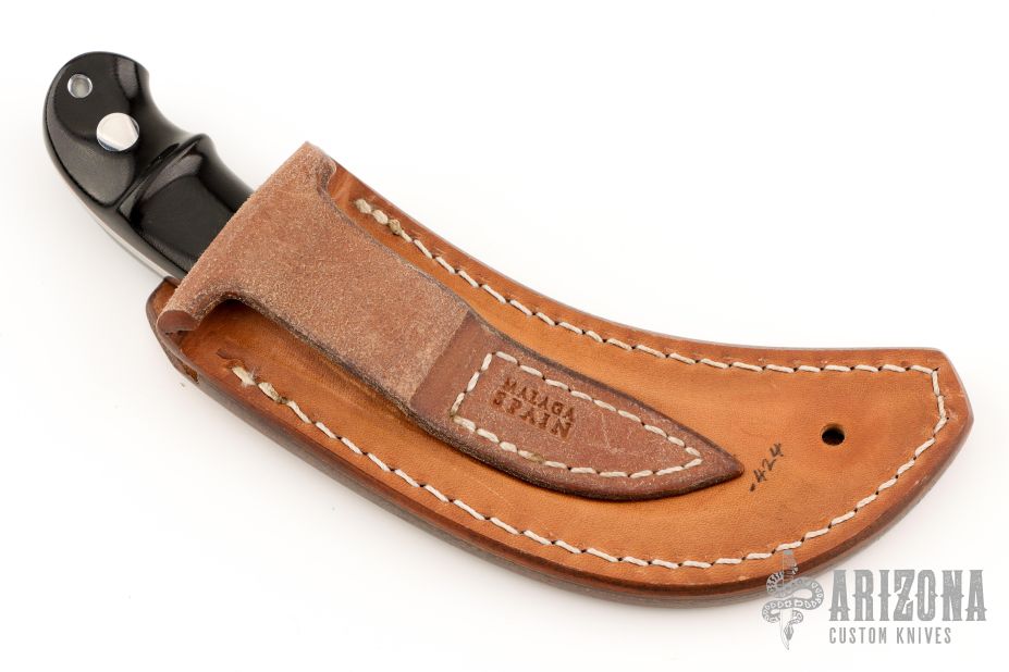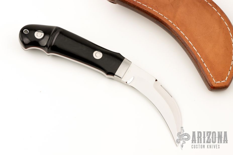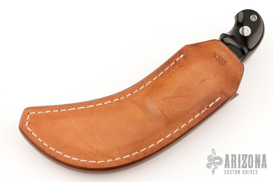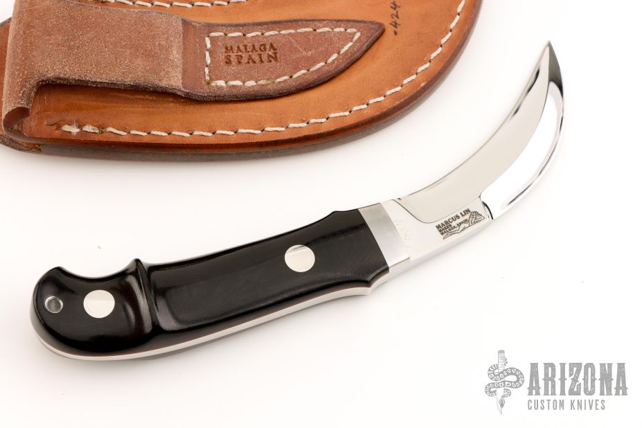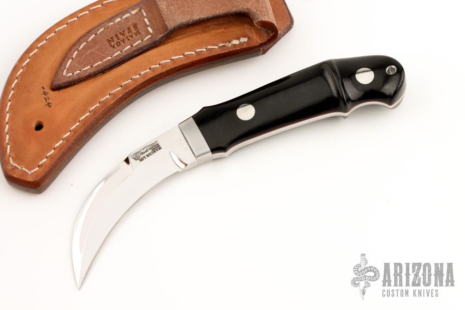 This Loveless Style Hawkbill by Marcus Lin has a mirror polished blade and a false top edge, Single nude Loveless inspired logo, .212" blade stock and .817" blade depth, full tapered construction. The handle has a stainless steel guard, black linen micarta scales with red liners. #424 on ricasso. Comes with a brown leather sheath with matching number on the back. Excellent condition.