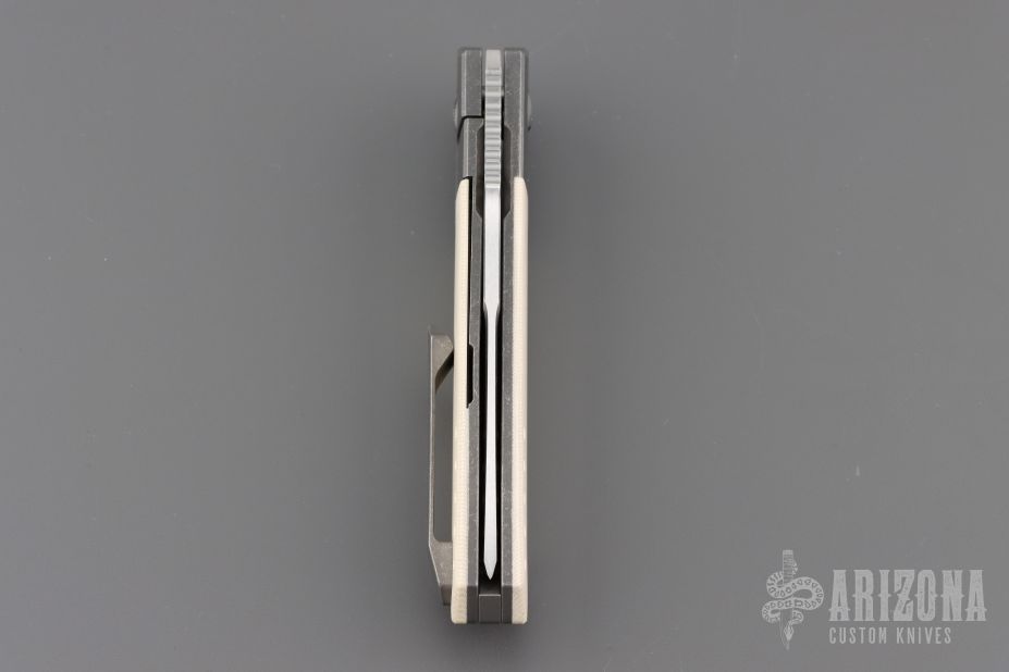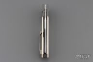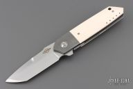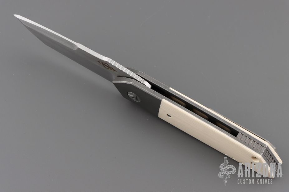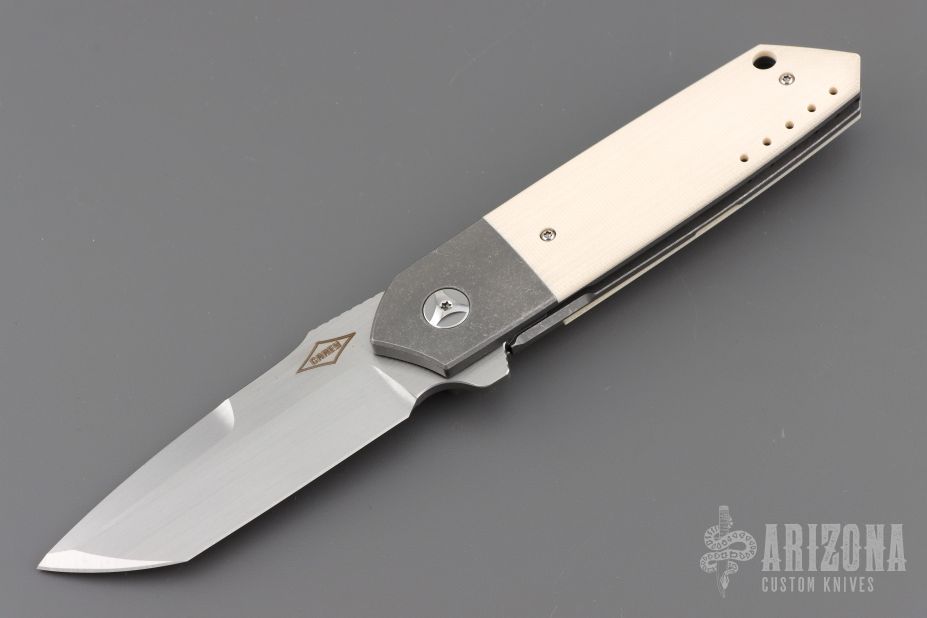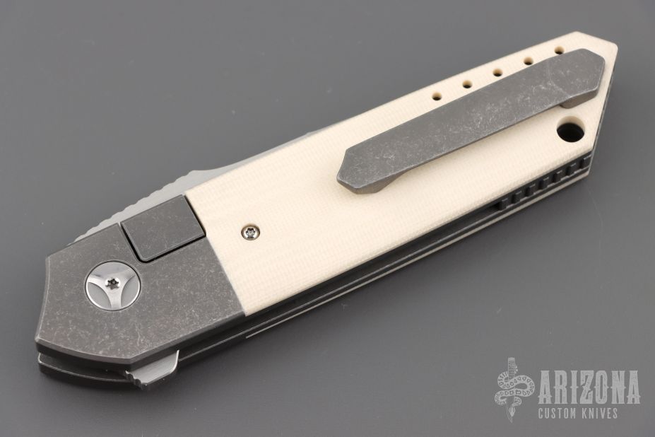 This Roadster was designed by Peter Carey and made by Mechforce.  The knife has a satin-finished tanto blade with a notched thumbrest and flipper tab.  The handle has tumbled titanium bolsters and liners with Ivory G10 scales.  Tip up titanium pocket clip.  Includes the original box and papers.  New from maker!
