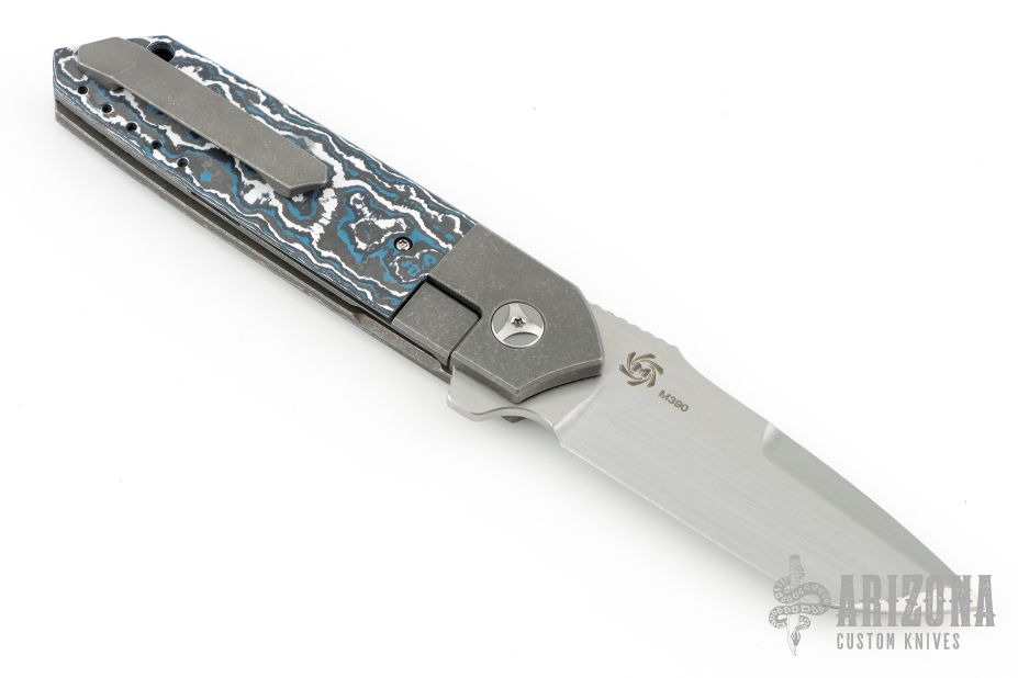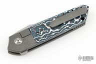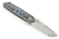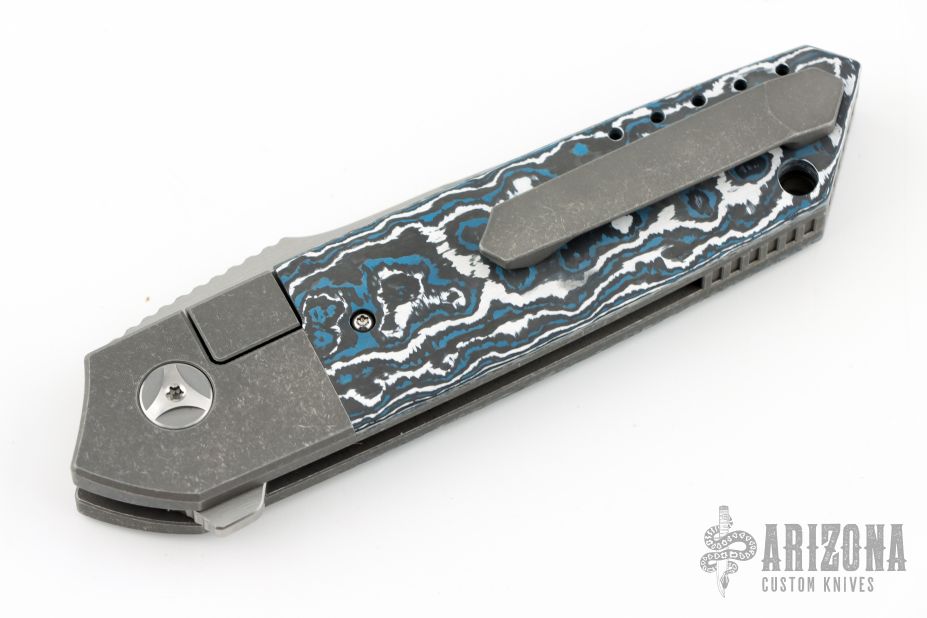 This Roadster was designed by Peter Carey and made by Mechforce.  The knife has a satin-finished tanto blade with a notched thumbrest and flipper tab.  The handle has tumbled titanium bolsters and liners with blue forest carbon fiber scales.  Tip up titanium pocket clip.  Includes the original box and papers.  New from maker!