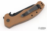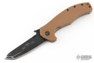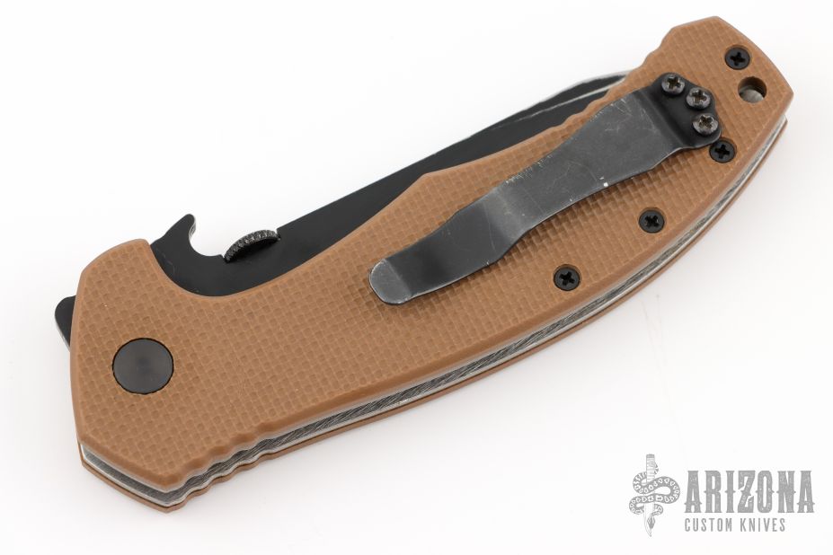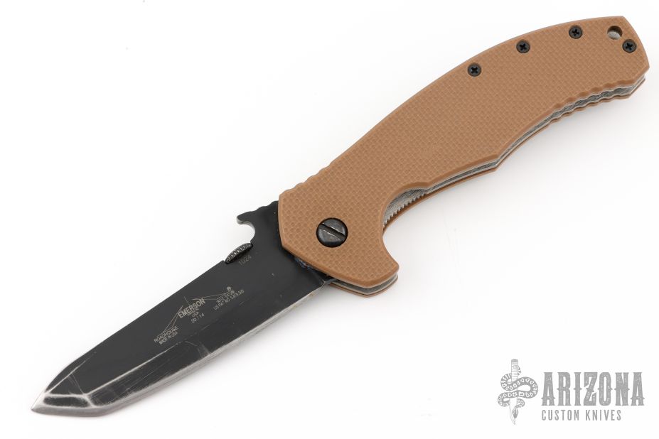 This Desert Roadhouse by Emerson Knives has a black blade with thumbdisc and wave feature. #1024 on blade, dated 2014. The handle has tan G-10 scales, titanium liners and a black stainless tip up clip. Nice detent, lockup and blade seating. Has scuffs, scratches, has been resharpened. Fair condition/good user condition.