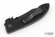 This Emerson Horseman linerlock folder features a black clip point blade with knurled thumbdisc, notched thumbrest and wave feature. The handle has black G10 scales, titanium liners, and black stainless steel clip positioned for tip up carry. Also has a black G10 backspacer and a lanyard hole at the butt. Dated 2014 with S/N #2436. Has scuffs and scratches, has been resharpened. Fair condition/good user condition.