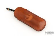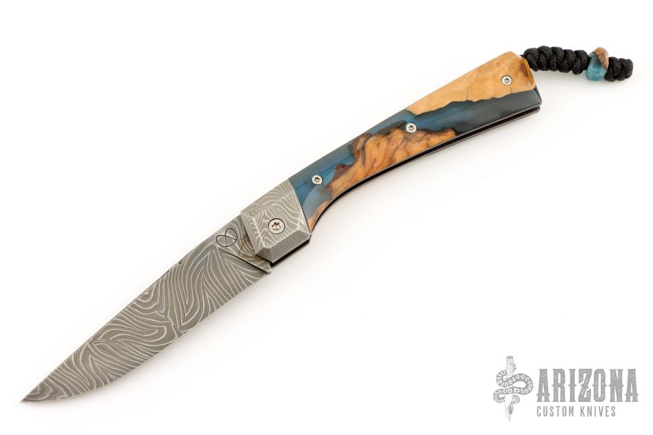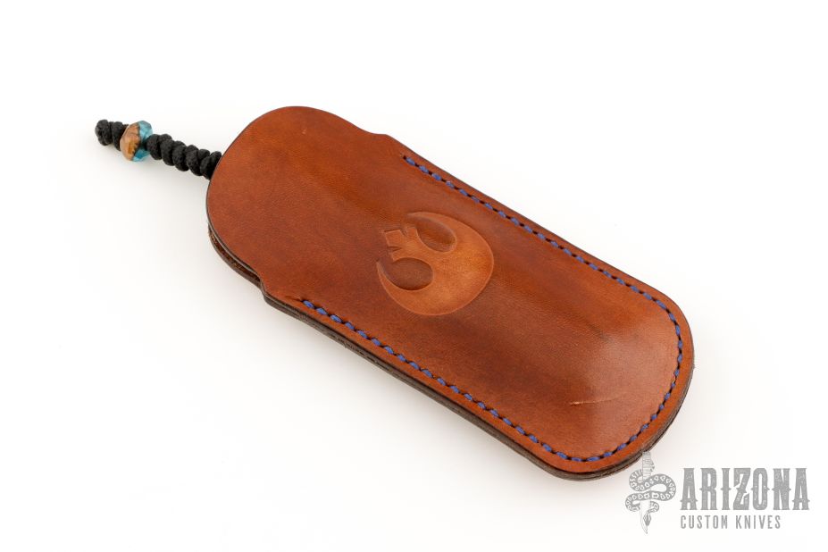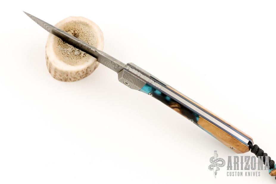 This Slipjoint by Florian Keller features a Damascus blade with fileworked spine. The handle has matching Damascus bolsters, wood covers stabilized with blue acrylic, blued steel liners, satin stainless steel spring with filework. Nice blade seating. Has a lanyard with matching wood/accrylic bead. Comes with a brown leather sheath with the Jedi Order's Insignia. Excellent condition.